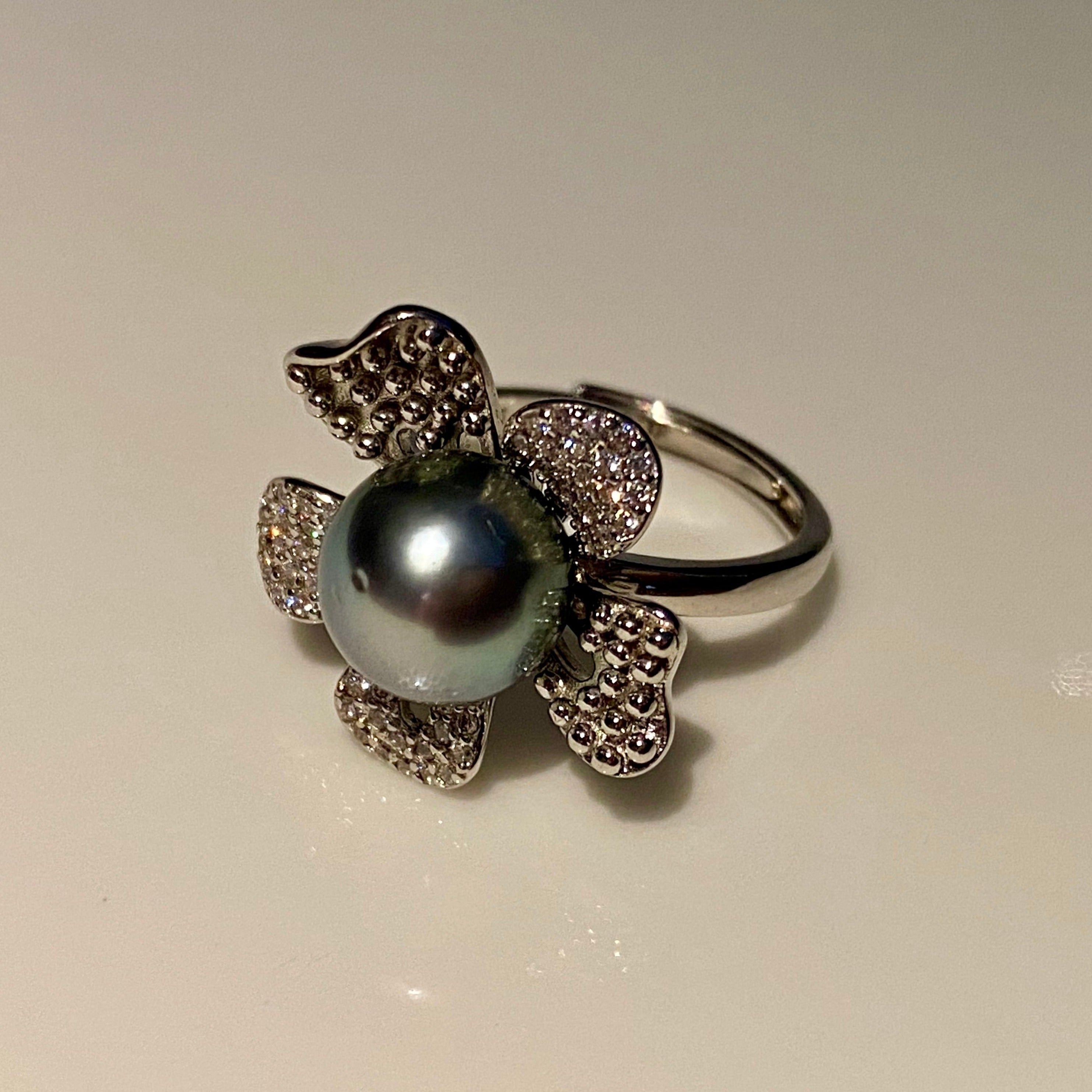 【Black Tahitian】11MM/S925 Silver/Floral Design/Adjustable Ring